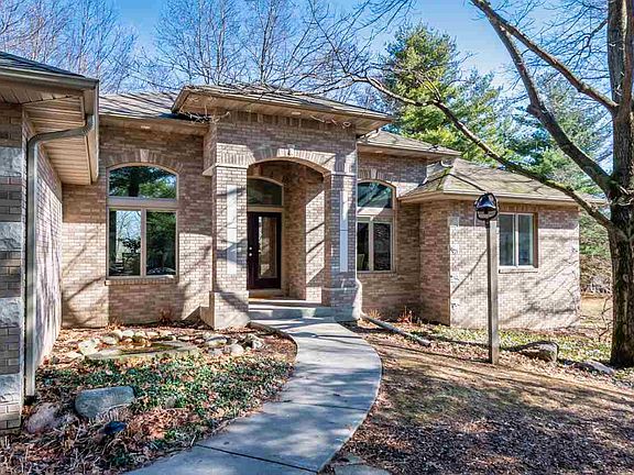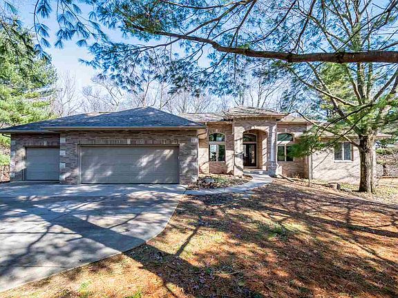Nestled in the soaring evergreens and colorful maples, a rare county acreage 10 minutes from downtown Iowa City. Open floor plan ranch w. vaulted ceilings, large windows of great room look out on private wooded lot. Generously sized rooms. Main level: 2 bedrooms, 2 1/2 baths, office w. French doors, kitchen w. breakfast room, opens to 3 season porch, dining and great room with wood burning FP on main floor. Walk out lower level: huge family room with gas FP, 2 bedrooms and full bath. Plentiful storage.