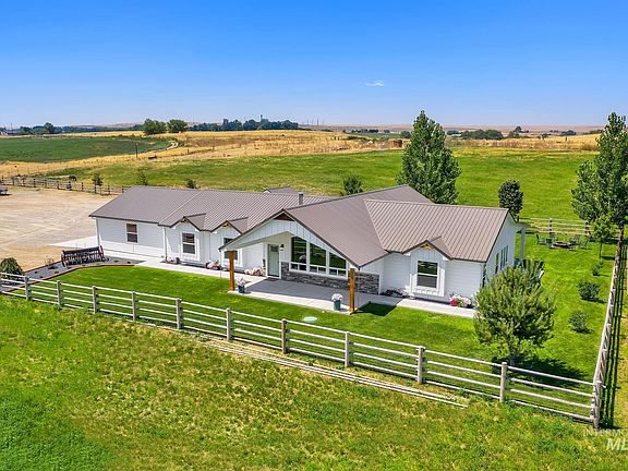 Welcome to your turn-key homestead, nestled against rolling hills with incredible mountain views. Bring your horses or other livestock to this fully fenced property featuring a tree-lined driveway leading to a beautiful new construction home with major additions done in 2023 and 2024. Property includes water shares for 11 acres, an individual well, fields of alfalfa and grass, RV hookups, a shed, and ample room for a shop/ADU. The garden area, chicken coop, and orchard with peach, apple, apricot, plum, and other fruit trees add to its charm. Enjoy expansive front and back covered patios, and a great room with vaulted ceilings and large windows, ideal for entertaining. The luxury kitchen features granite counters and a butler's pantry while the desirable split bedroom floor plan offers 4 bedrooms and 2.5 bathrooms, LVP flooring throughout, a large laundry room with mudroom, two water heaters, and an automatic sprinkler system for the yard. Start dreaming because this rural retreat holds endless possibilities!