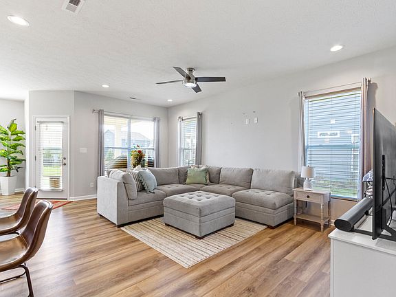 Welcome to this beautiful 2 bedroom/2.5 bath low maintenance paired villa in popular Whitestown with over 1,600 sq ft! The open floor plan creates a sense of spaciousness and facilitates easy flow between different areas of the home. A large great room provides a versatile space for living and entertaining. The kitchen features a large center island with pendant lights, pantry, gas stove, quartz countertops and stainless appliances! An open connection between the kitchen and sun drenched breakfast room enhances the sense of space and provides a casual dining area for everyday meals. The generously sized owner's retreat offers a tray ceiling with ceiling fan and ensuite bath with long, raised vanity with double sinks, walk-in shower with tile surround and private water closet. The owner added an extra door in the walk-in closet leading directly into the laundry room for added convenience! The 2nd bedroom is separate from the owners suite and features a private, full bath with tub/shower combo and walk-in closet. There is an additional 1/2 bath for guests. Oversized garage with 2 ft on either side of garage door and extra bump out for bikes etc! The upgraded, extended, covered 14x12 veranda off of the great room has plenty of space for furniture and a grill is perfect for entertaining and relaxing at the end of the day! Invisible fence encompasses front and back yards! Water softener included. Blinds installed by Blind Faith - new construction does not include window coverings! Easy access to I65, shopping and Main Street Park. Ride your bike or take a short drive to Moontown Brewery, LA Cafe and Hattie's Coffee Shop! Lawncare, snow removal and exterior maintenance included at an additional $155/month!