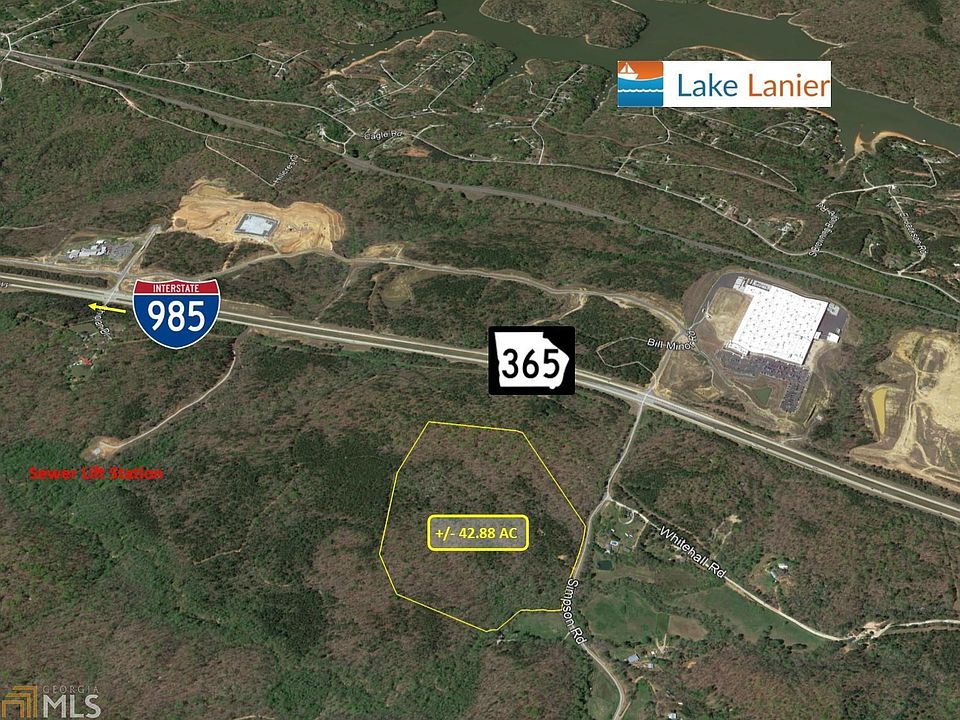 42.88 acres of wooded land with over 700 feet of frontage on Simpson Road. Traffic counts of 31,000 VPD on close-by Hwy 365. This is a unique property due to its 476 AC neighbor which boasts tremendous entitlements. Those include nearly 500,000 Sq.Ft. of Commercial space, 85,000 Sq.Ft. of Office space, 280 apartment units, 30 townhomes and 186 single family residential units. All utilities are available including sanitary sewer gravity line and pump station in place just .5 miles away. Topography is rolling to sloped. Zoned AR-IV. The subject property is located along the rapidly growing I-985 / Highway 365 corridor. Short drive to Gainesville. Unincorporated Hall County Across Street from Hall Co Industry Gateway.