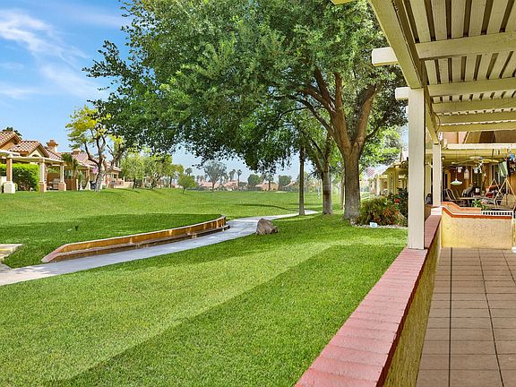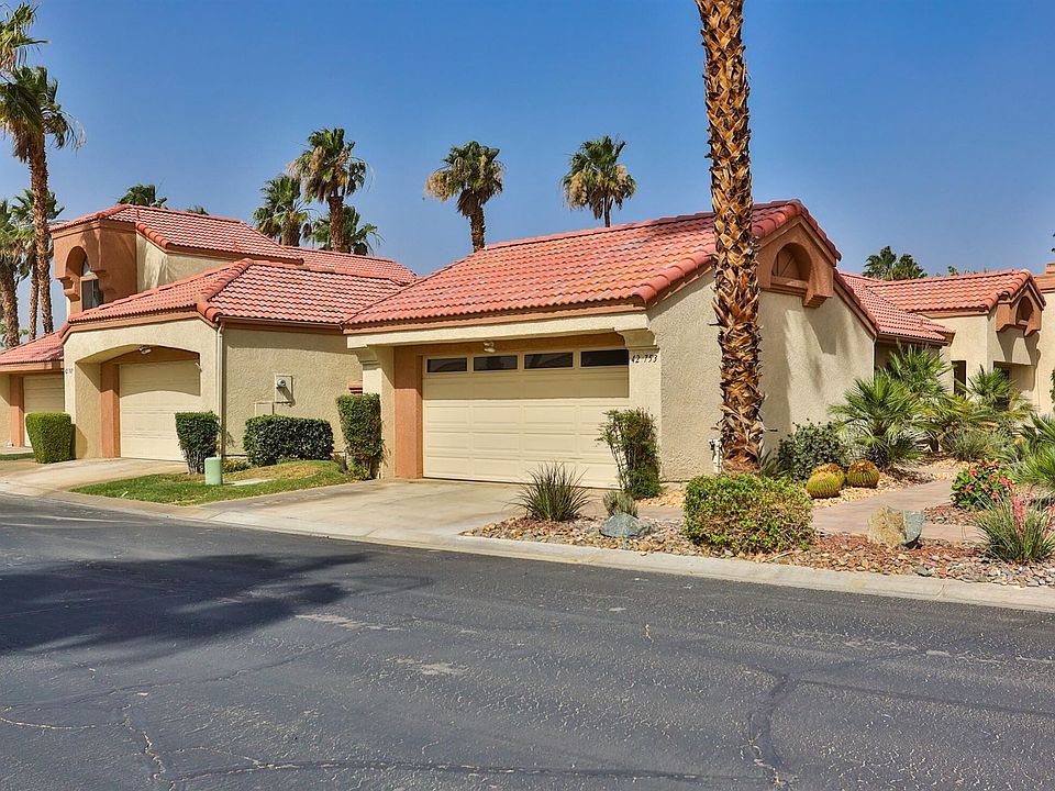 A fabulous condo right on the golf course with great views of the 18th fairway. This property offers two master suites with an extra half bath. One of the bedrooms is set up like an office with a built-in desk and shelves with enough room for a bed and bedroom furniture. Property has brand new carpeting, a complete interior paint job, newer hot water heater, and newer AC unit. The nice covered back patio offers nice views of the 18th fairway, and there is also a BONUS private patio off the master bedroom for morning coffee or lounging in your PJs. (Some have converted these patios into a golf cart bay.) Property boasts tall ceilings, a 2 car garage with epoxy floor, nice tile and carpet mix, great room floor plan with huge open feeling and plantation shutters, granite slab countertops and newer (expensive) Milgard windows and sliders. Light and bright with lots of space to make your own. Home comes with social membership to the club, expanded cable with HBO and Showtime, trash service, periodic pest control and most exterior maintenance including roofs. Fantastic central Palm Desert location inside the prestigious gated Oasis Country Club. This club has a newly renovated clubhouse offering casual and formal dining, a workout facility, tennis and pickle ball courts, an 18 hole putting green, a golf course, 18 pools and spas, and beautiful verdant landscaping. HOA allows rentals with 30 day minimums. See CC&Rs for all details. Come make this your oasis under palm trees!