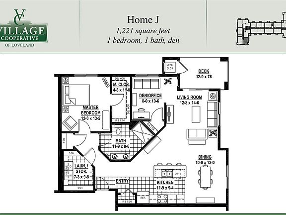 Designed for active adults (55+), this unique, 1 bedroom, 1 bath home with den features a kitchen island and and an open layout with adjacent living and dining areas, plus a large deck. In-home laundry and storage included.