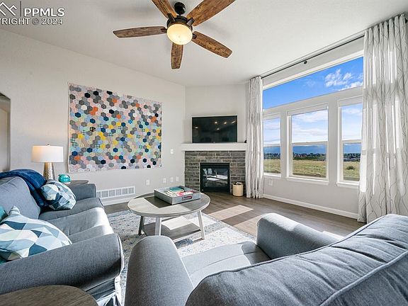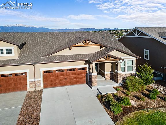 Immaculate one owner patio home in The Enclaves at Mountain Vista Ranch! Open concept floor-plan allows for tons of natural light as well as beautiful views from your living room, complete with gas fireplace. Kitchen boasts stainless steel appliances, granite counters, upgraded white cabinets, and a large breakfast bar. Main level primary bedroom features a walk-in closet, large bathroom with double vanity, and large shower. Enjoy your fully finished basement ready to go for entertaining with plumbing available to add a wet bar. Additionally there are two large bedrooms (with walk-in closets), a full bathroom, and large storage area to complete the finished basement. Perfect home for those seeking low maintenance living. Enjoy easy access to all military bases and the best shopping/dining that Colorado Springs has to offer!