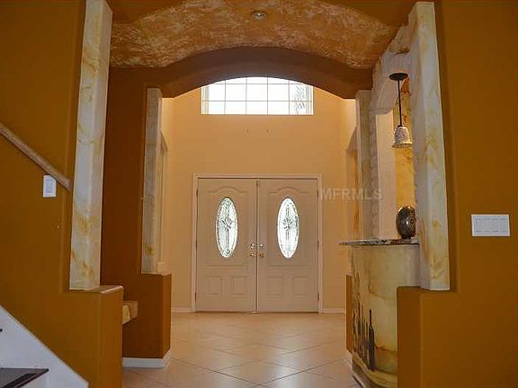 Wonderful, sprawling home in a great location. Soaring ceilings, designer faux painting, large rooms, wood cabinets, 20 inch tiles on diagonal, huge screened lanai....what a house! There are a total of five bedrooms, 4 up and one down. Great kitchen with stainless appliances, family room with decorative ceiling details, designer fan and built-in area for your tv. Dramatic stairwell with wood railings, balustrades, steps and risers. There is a formal dining and living room and a beautiful serving/bar area between the foyer and living areas. Outside you will find a huge screened in lanai with cast concrete fountain. The second floor contains the master suite and four more bedrooms, all of huge size and some with built-in desks. The dramatic walkway to the master suite really makes a statement. If you want a large home, with shopping, dining and more very near-by, low HOA fees and no CDD - this is the one.