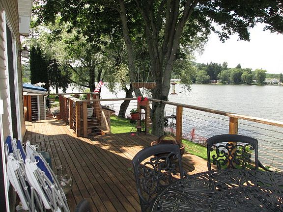 Custom Chalet on 50 ft. lake frontage living! Open decks! Main floor has sun room, open great room w/wood stove, bamboo floor, cathedral ceiling. Kitchen w/maple cabinets, SS appliances. 2 BD's w/large closets & full bath. Loft is master suite & office area, full bath! Fabulous views! Finished lower level walk out to yard, lake, patio, hot tub. LL has 1/4 bath, laundry, storage. Gardens & 2 car garage! SREA Electric! Enjoy motor boating, kayak/canoe, swim & fish! In addition, selling adjacent property @ $29,500! Single wide, well, septic, garage, on 0.67 acres. Easy access to I-390 & I-86!