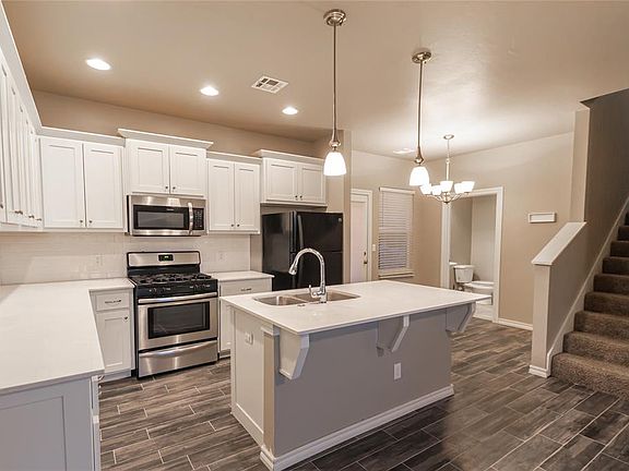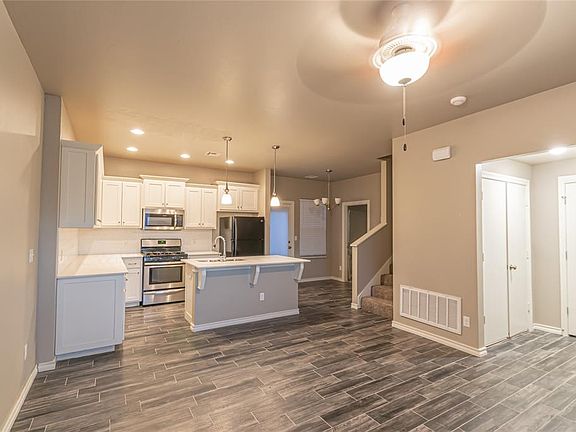 Charming 3 bed, 2 ½ bath, one car garage located in quiet area in east Edmond, close to I-35. This home features a neutral color pallet with wood look flooring. Eat-in kitchen includes quartz counter tops, abundant cabinet space, breakfast bar, garbage disposal, and stainless steel appliances (gas range, built in microwave with vent, and dishwasher.). It is bright with lots of natural light. Half bath down with full size washer and dryer connections. All beds up, master has en-suite with tiled shower. Ceiling fans in master and living room. Built to NAHB Building Standards and includes post-tension foundation, custom shop built cabinets, white subway tile backsplash in kitchen, high definition lifetime shingles, HERS rating, and 14 seer A/C unit. There is 5 years left on the structural warranty. Schedule your private showing today!
