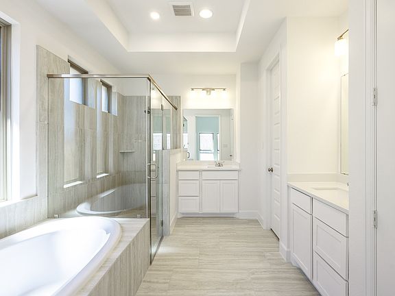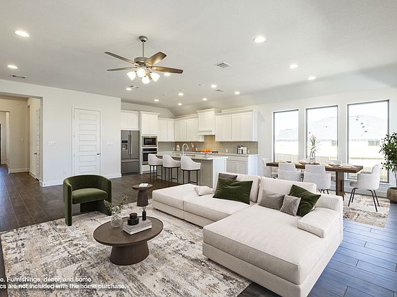 Home office with French doors off extended entry with 12-foot ceiling. Spacious family room with wall of windows opens to kitchen and dining area. Kitchen offers walk-in pantry, 5-burner gas cooktop and generous island with built-in seating space. Private primary suite includes bedroom with wall of windows. Double doors lead to primary bath with dual vanities, corner garden tub, separate glass-enclosed shower and large walk-in closet. This open one-story design features a guest suite with full bath. Abundant closet space throughout. Extended covered backyard patio. Mud room off three-car garage. Representative Images. Features and specifications may vary by community.