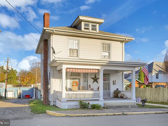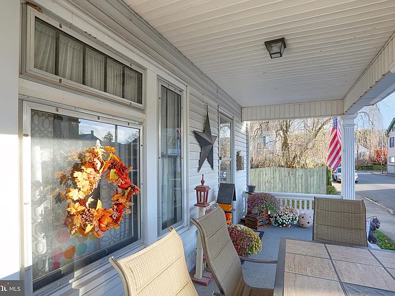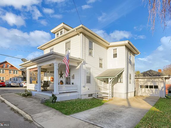 This 3–4-bedroom 2 story offers the joy of affordable and comfortable living spaces. Welcomed by the stately pillared covered front porch, enter the living room with a cozy fireplace accented by display bookshelves. Opening to the formal dining room offers a spacious gathering space. The vintage eat in kitchen offers appliances, half bath and access to the covered back porch. Second floor offers 3 bedrooms, one with access to the upstairs sunroom, full bath, and possible 4th bedroom/office space with attic access. Central A/C, macadam driveway, detached garage as well. Adding your special touches to this great home will make it “Your Happy Place”!!