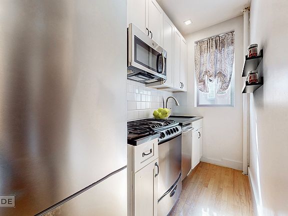 The apartment is move-in ready with finished hardwood floors, high ceilings, and plenty of natural light that make the space feel bright and airy. The windowed kitchen has been updated with sleek stainless steel appliances (including a dishwasher and microwave), and the bathroom has a modern, fresh feel. You'll also love the generous closet space for keeping things organized.