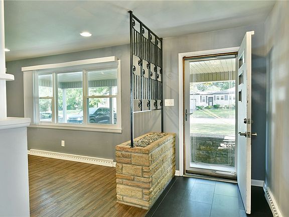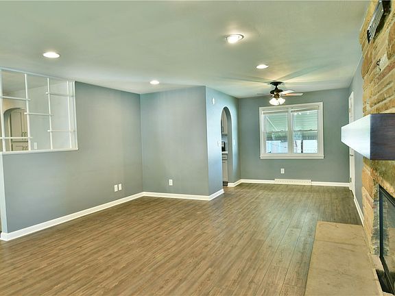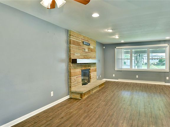 Fall in love with this tastefully updated Farrell ranch and its lovely three bedroom layout! Attractive from any angle, the home is quick to catch your eye with its bold steel roof and stonework that accompanies a covered front patio space. Adding to the appeal, a fenced in backyard features a storage shed, firepit and large awning for easy entertainment. Through the front door, a brightly lit foyer displays its wrought iron accents. Hardwood styled flooring runs underfoot, spilling into the nearby living room flooded in natural light by the large picture windows. Plenty of dining space is located at the far side as a sculpted archway leads into the daring kitchen. Custom cabinetry, stone countertops and a glass tile backsplash easily flatter for looks. Down the main hall, a trio of bedrooms branch away. At the end of the hall, a lovely full bath showcases a striking glass door shower. Downstairs, the renovation ready floorplan includes rec space, a bar area, and a second full bath.