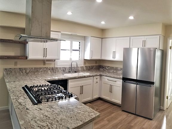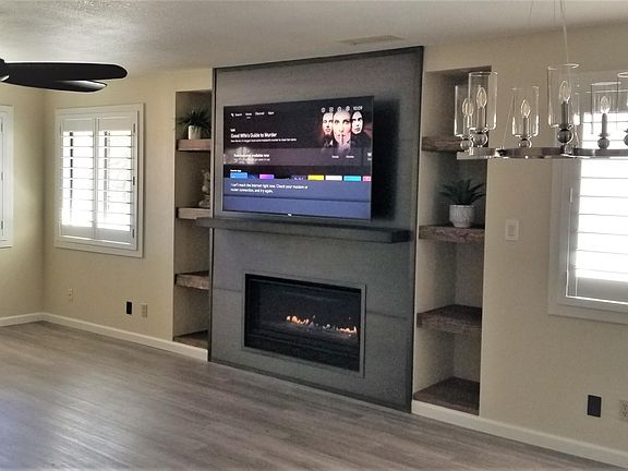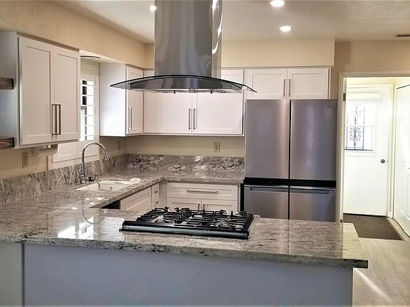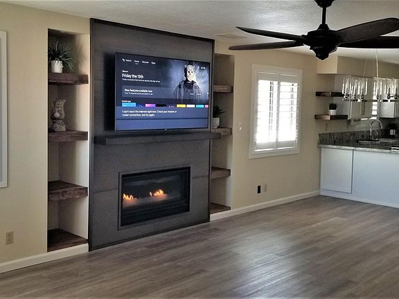 Lovely two bedroom two bath townhome with a large extended covered & uncovered patio. Patio could be used as an additional carport space and still have a patio.This unit has been stunningly redesigned with all new kitchen cabinetry w/granite countertops, new stainless steel appliances installed in 2022* Beautiful glass China breakfront cabinetry has been installed with lots of drawers, micro wave and counter serving area*The natural gas fireplace has been moved & centered in the great room and redesigned with a steel metal frame and wood shelving w/lights*NO Popcorn on ceilings just nice textured ceilings with ceiling fans*Full size washer/dryer in laundry area*Single car garage right outside backdoor*New HVAC & Water Heater 2022*Large green belt park*
