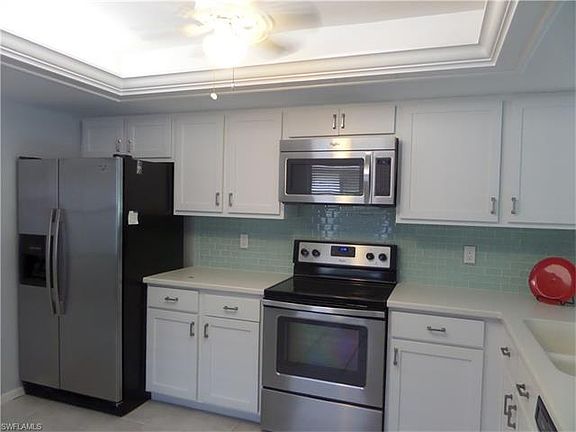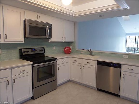 Golf course location and renovations galore! Updated kitchen with new cabinets, glass block back splash, newer Whirlpool stainless appliances, recessed lighting, Corian counters and under mount sinks with new faucet. Tile flooring, new shelving in pantry. New hot water heater (1/2016). Open floor plan with tile flooring in LR, DR and lanai. Doors removed from LR to lanai to create more livable space. "Pergo" wood floors in both BR's. French doors from MBR to lanai. New ceiling fans throughout. Both baths have been renovated with new vanities with granite tops, new faucets, decorative mirrors and lighting, tiled showers with glass doors and new toilets. Interior freshly painted. Exterior painted Spring, 2016. 27 holes Championship golf included. Clubhouse with fitness facility, library, full service restaurant, grill room, Pro Shop, driving range, practice putting greens and sand traps, 3 Har-Tru tennis courts and lap pool. 5 miles from downtown 5th Ave. shopping, dining, live theater, art galleries and pristine Gulf of Mexico beaches. 25 min.from Regional Southwest Airport. Easy access to I-75 No. and So. Quick trip to Marco Island. Electric storm shutters on lanai.