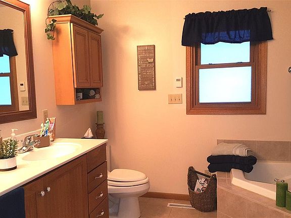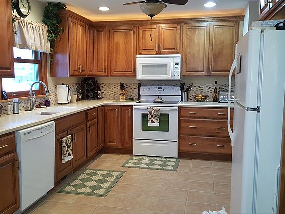Wait until you see this newly listed 2 or 3 bedroom home with a back yard that turns into a golf course!! When you walk thru the brand new designer front door into a home that has livability written all over it---large living room with beautiful hardwood floors and just new carpet, a dining room adjacent to the 2015 remodeled kitchen with indirect lighting, two larger bedrooms, bath with heated floor tiles, corner whirlpool tub, separate shower, and downstairs, a finished family room or extra bedroom complete with bar and pool or tennis table. A workshop that has tables and storage already in place, and a stool, sink, and shower that would be easy to wall in and finish is perfect for the handy or crafty person of the house Go outdoors thru the glass sliders in the four season porch and deck that was added in 2015 and take a look at the fire pit and 16x16 patio--perfect for your fall evening enjoyment. There is also a brand new hot tub, just installed for $8500.00 that can be purchased separately.The new 2014 garden shed that is 14x16 makes for easy storage for your mower to take care of the 2015 newly installed landscaping from McKays Nursery for $3,000.00. PLUS the roof and vinyl siding was replaced in 2015 and the GFA and CA were redone in 2014 and the water softener will stay and the gas hot water heater will be replaced new before closing. This home is on a large lot in Lena's Stagecoach Trail Golf Course, and NOW all you gotta do is hop in your golf cart, drive over, and check in!!! Get settled before Spring and work on your golf game because there is nothing to do here but relax and enjoy!!