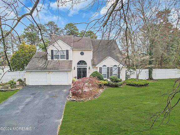 Colonial home situated on lovely Lake Riviera in Brick. Beautiful views. Huge lot with tons of privacy. Dramatic 2 story entry way. Living room with cathedral ceiling. Dining room. Family room off the Eat in kitchen. Sliders off Kitchen that lead to a large patio and inground pool with electric awning. Laundry room. Four bedrooms upstairs. 2 car garage that has been converted to huge game room. Real man cave! Can easily be converted back. Home features laminated wood flooring, ceiling fan, outdoor lighting, firepit, recessed lighting, fenced in yard, shed, and beautiful landscaping. Home overlooks private tranquil setting of lake Lots of activities to explore including walking trails, parks, and beach!!!