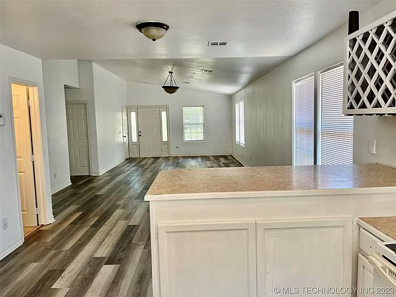 Don't miss this bungalow with large covered front porch. 3 bedroom and 2 full baths with attached 2 car garage. Large living/dining area. Open concept. Hard surface flooring throughout. Inside laundry with pantry. Easy access to Sand Springs expressway, bike/jogging trails. Close to park/picnic area and minutes to downtown Tulsa.