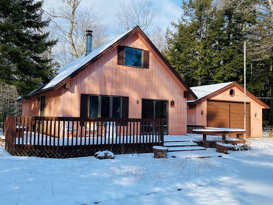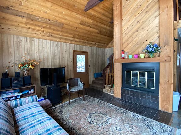 Quiet woodland seclusion can be found at this home and property. Drive into the two car garage out of the weather and enter your very own Island retreat. Start a fire in the fireplace, relax and enjoy nature's views out of the expansive front window and glass door. The kitchen has ample cupboard space and a serving pass-through into the combined dining and living area. Dine in or barbecue and serve out on the wrap-around deck.