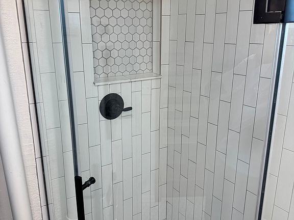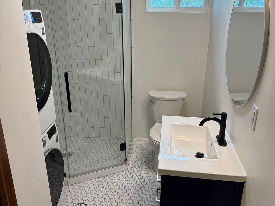 Two full bathrooms: one showcasing a chic tiled glass shower, the other fully refreshed with clean design.