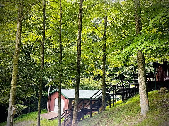 Just 8.5 miles from the interstate but tucked in "the middle of nowhere", the "Corner Creek Retreat" will have you wanting to stay longer than just the weekend. The gated driveway welcomes you to a valley that nestles a peaceful creek. Pulling up to this 1078 sq ft Amish built cabin, the hemlock siding and the metal roof has all the charm you're looking for, complete with a front porch that will make you want to kick up your feet and listen to the sounds of nature, because that's all you're going to hear on Perkins Fork. Built in 2010, the cabin has cathedral ceilings open to the loft above. The spacious loft fits a queen and two full beds. The living, dining and kitchen are all part of the open living space. The wood stove keeps the cabin cozy in the cool months but there's also electric heat for your convenience. There's a lot of perks to this well-built cabin in the hollow including beautiful hickory floors, cherry trim, new cabinetry, high efficiency windows, appliances, and a private master bedroom on the first floor. There's a separate mud-room on a deck level below the main cabin which is perfect for storing all your scent protected camo and other hunting gear. The 24x36 detached garage is heated with a wood stove and will hold all of your ATV's, lawn equipment, tools, etc. 46 acres of surveyed privacy that has an abundant amount of wildlife,(whitetail deer, wild turkey, black bear, squirrel, etc), and some marketable timber. (Appraisal on select cut hardwoods on file.) There are dozens of great spots to set your tree stands and there are bridges built to cross the creek to access these hot spots for game. There are great maintained trails to hike or ride your ATVs. Beautiful yard, private well and septic. Close to Sutton Lake for any and all water-sports you might enjoy! This getaway has it all and can be yours for $195,000.