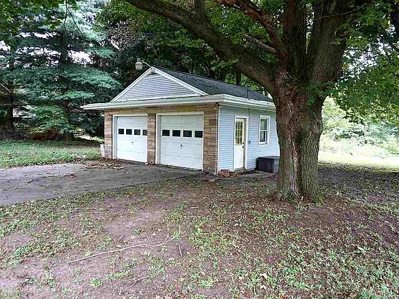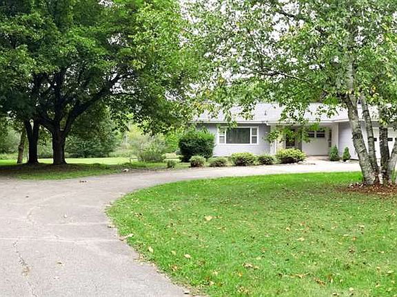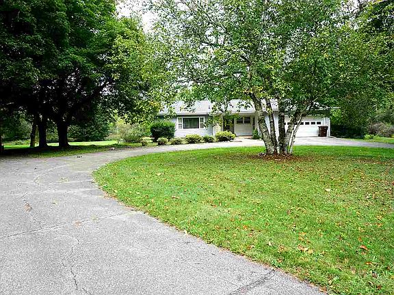 You will be sold as soon as you see the view thru the wall of wrap around windows overlooking this park-like piece of paradise. A Living room fireplace with built in shelving is the perfect accent to the cove ceilings throughout the home. This sprawling ranch is situated on 6.77 acres includes a stream trickling through the property and its very own pond! The house includes not 1, but 2 bedroom suites each with its own full bath! The 3rd bedroom has a half bath just across the hall! Downstairs in the finished basement you will find another wall windows, a second kitchen, a beautiful brick fireplace, a 3rd full bath and another huge bedroom with windows overlooking the bridge that crosses the stream! All new flooring in the family room and downstairs kitchen, Tons of storage, so much living space and to top it all off, there are 2 garages; a 2 car attached and a 2 car detached and not 1 but 2 Walkouts! Huge windows in every room! Move in and enjoy the setting while making it your own!