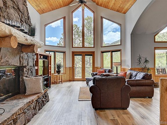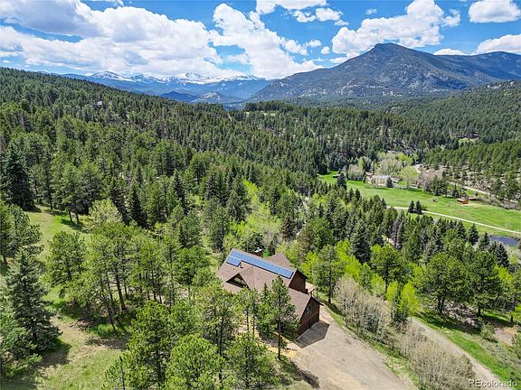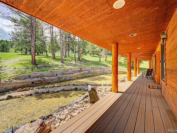 Welcome to this stunning classic mountain-style home situated on a pastoral 5-acre lot in the coveted Upper Bear Creek area. Boasting picturesque mountain views, privacy & quiet, this wonderful home offers a perfect retreat. Upon entering the home, you will be struck by the soaring vaulted ceilings and warm ambiance provided by pine beams, cabinetry, and T&G ceilings. The large windows throughout the home allow for plenty of natural light & provide snow-capped mountain views. The impressive stone fireplace adds to the cozy lodge feel of the home. With its open flow and design, the large kitchen welcomes everyone to gather with plentiful granite counters, high end appliances, breakfast bar and adjoining dining space. The main level primary suite is expansive, with vaulted ceilings and access to the deck. The 5th bedroom off of the kitchen makes a perfect main level office. The outdoor options include the expansive deck with all new decking and rails. This is perfect for outdoor living with views of your acreage, aspens and mountains. Other options are the large charming front porch - enjoy your morning coffee & watch the sun rise from here! Fun times will be had downstairs in the huge recreation room with a wet bar & fireplace, which also accesses the patio. Two additional bedrooms, work-out room, storage & bath complete the lower level. The home features new flooring & radiant in-floor heat creating a comfortable interior all year-round. High-speed internet, natural gas, water filtration, and solar panels make this home both functional and convenient. The 3-car garage has electric car chargers, and there is plenty of additional storage throughout the house. There is ample horse potential on the property including a fenced corral, and the aspens and meadow create a tranquil setting. This home is perfect for those who seek the mountain lifestyle just minutes to Evergreen Lake, trails and amenities! See video & more photos at https://v1tours.com/listing/46250