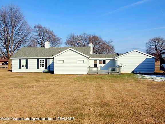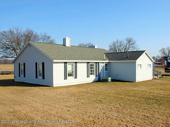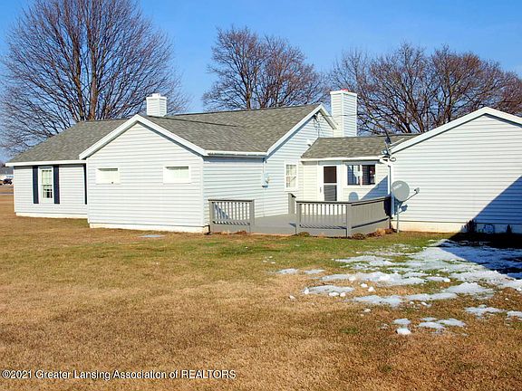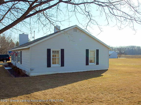 Cozy well-cared for home with EZ commute to Lansing and St. Johns. Beautiful Oak kitchen has lots of cove molding and solid surface counter tops, all appliances stay except washer and dryer are reserved. Laundry room is beside with newer gas hot water heater and brand new 200 Amp service. Lots of shelving for much storage in there too. Nice long larger living room/ dining room combination with huge stone fireplace and oak trim and mantle. Fireplace is ventless gas log. 3 bedrooms, one of which is being used as an office, everything carpeted everywhere. House is Block construction with insulation upstairs and wrapped around the house with vinyl siding. It is easy to heat (possible to use the fireplace) and so quiet and restful. One car garage attached to the breezeway