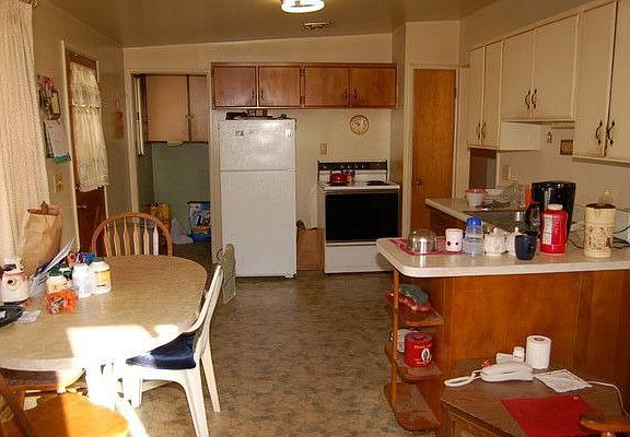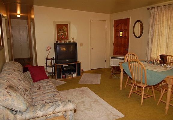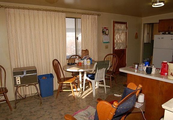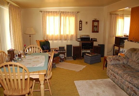 Newer patio roof, furnace, water heater, AC, and refinished hardwood floors! One-level living with style! Vaulted ceilings, open living room - dining - kitchen, two bathrooms, two bedrooms (one is two original rooms merged into one huge room), huge covered patio, storage shed, extra-deep garage. All appliances stay w/full-priced offer.