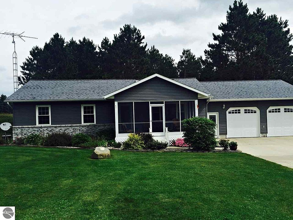 Beautiful ranch style home in private country setting. Although only 7 miles north of Clare, the privacy and serenity of this home on 6 acres are hard to beat. Everything about this home shows how it was meticulously cared for. 3 Bedrooms and 2 bathrooms are located on the main level. The master bedroom features a private master bath and spacious walk-in closet. Many high quality materials make up the home. The great room that includes the kitchen, dining, and living room, serves as a perfect gathering space. This room features solid oak cabinets, quartz countertops, tile flooring, and oak wood flooring. All bathrooms have granite vanities and tile flooring. Basement includes a 4th bedroom, 3rd bath, office, and large family room. Enjoy the wooded view from the 3 season room off the back of the home and screened in front porch. An additional 10 acres also available.