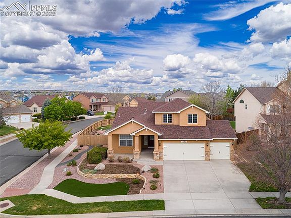 Don’t miss the opportunity to own this wonderful home with an assumable loan! This property features a desirable main floor primary suite in the Spring Ranch Golf community and sits on a large corner lot with views of Cheyenne Mountain. Completed by respected builder Keller Homes in 2001, it is now being sold by the original owners who have lovingly maintained this home. The main floor is inviting with a formal dining room with western views, an open kitchen featuring stainless steel appliances, granite countertops, a center island, pantry and dining space. The adjoining family room features a gas fireplace and views of the beautiful backyard. The primary suite includes two walk-in closets and five-piece bathroom with soaking tub. Upstairs you will find two spacious secondary bedrooms, a full bathroom and a lofted space with built-in desk which offers flexibility for an office space or den. Downstairs, a cozy family room is complete with a gas fireplace and built-in cabinets. A secondary kitchen space is ideal for entertaining or a mother-in-law space with refrigerator, microwave, wine fridge and dining area. Two additional large bedrooms with a full bathroom complete this floor. The outdoor space is unparalleled as the lot size is one of the largest in the neighborhood offering multiple sitting spaces, a water feature & mature plant. Updates include new front door, new patio door to the backyard & new windows in the living room and primary bedroom looking out on the backyard. With a an air purifier, security system and plans for a new City park at the end of the cul-de-sac. With convenient access to restaurants, shops and grocery stores and located within the District 49 schools, this home truly has it all.