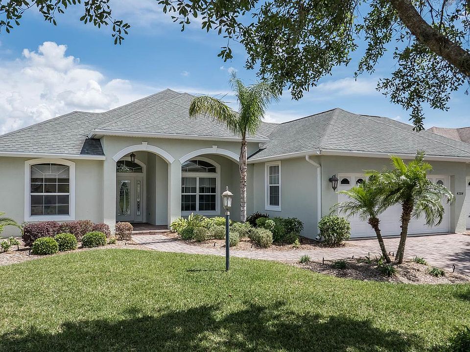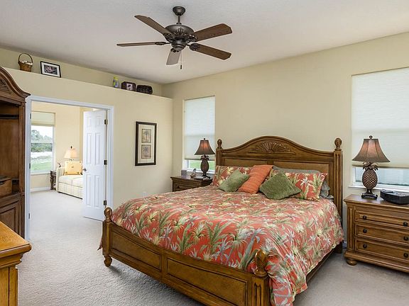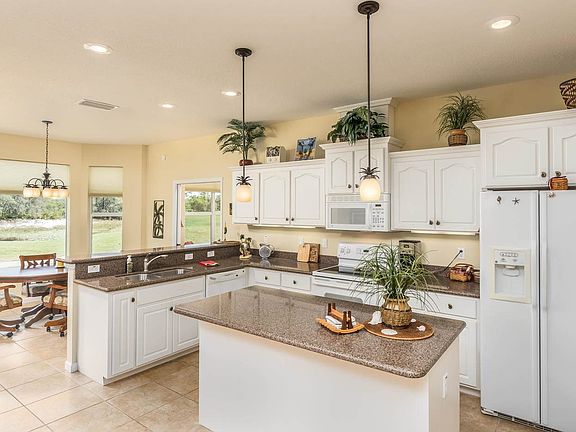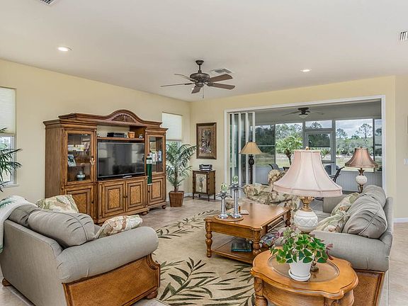 Fabulous 3 BR, plus office golf course home! So many upgrades and features including ceramic flooring, high ceilings, etched glass front door, custom lighting, pavered drive/walkway and 2 car, plus golf cart garage. The chef s kitchen boasts white cabinets with quartz counter-tops, center island, breakfast bar and two pantries. The Owners Suite is spacious and boasts a spa-like bath with double sinks, roomy shower and private water closet. The flex third BR is currently being used as a sitting room from the Owners Suite. The Lanai offers a gorgeous view of golf course and has vinyl windows for those chilly winter evenings. This active adult community offers pickleball, tennis, golf, library, two pools and fitness room.