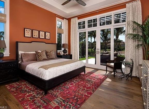 The Mon Paradis' country French design's open living environment flows easily from one area to the next. The graceful design is juxtaposed with rustic French influences in the home's vaulted dark wood beamed ceilings and wire-brushed white oak flooring. The color palette includes clean white walls and a blend of chocolate browns, creams, linens, and terracotta tones. Woods throughout the home are rich and dark with a preponderance of creamy linen upholstery for light natural texture and contrast. The floor plan's numerous gathering places are ideally suited to formal or informal entertaining with family members and friends in total comfort, including McGarvey Custom Homes' hallmark Tropical outdoor Living Area that offers 1,053 square feet with a custom pool and spa, covered spaces with pool-roll down screens, a summer kitchen, and a fireplace. The home's kitchen commands attentions. Sharp contrast has been created with the island and lower perimeter cabinetry in black while the upper perimeter cabinetry is classic white. Two south-facing vaulted windows over the gallery sink provide natural daylight. This dramatic expanse is unadorned to complement the home's streamlined look.
