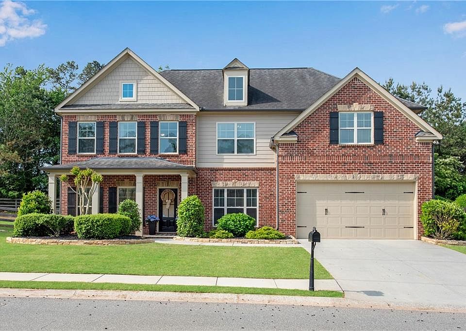 Must see this stunning, well maintained 5 bedroom , 3 bath brick and stone light filled home .A superiorly designed house with spectacular views from the full covered front porch, covered back veranda , or large extended patio custom built fire pit perfect for outdoor living and dining . lush mature professional landscaping with sodded front and back lawns and a fenced, level, wooded back yard. Hardwood flooring throughout the main area, and iron balusters complement a stunning two story foyer and great room. The formal living room with French doors can also be used as a home office.The spacious formal dining room has a coffered ceiling and wainscoting. Open floor plan with natural lighting throughout. Picturesque great room with marble fireplace, built in bookcases. Engineered hardwood floors on main level. A dream kitchen with an abundance of custom built-in cabinetry, quartz countertops, recently updated GE Profile dishwasher, stovetop & over, sharp drawer microwave stainless steel appliances and a tile backsplash, and a large center caterers island with seating . walk-in pantry for storage. Spectacular two story keeping room with a wall of two story windows.. Full bedroom and bathroom on main. Large luxurious master suite on upper level with a sitting area and a large walk in closet with built ins. Elegant spa-like retreat master bathroom has garden tub, large shower with double vanities and separate water closet. Upstairs laundry room. Large secondary bedrooms on 2nd level. Hunters Walk community offers a swimming pool with water features and tennis courts as well as a playground and sidewalks. Community has street lights. Nearby parks include Sawnee Mountain Park, Ducktown Park and Little Ridge Park with access to lake Lanier, all under 5 miles away. Dine in nearby Vickery or Halcyon.