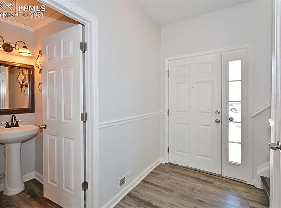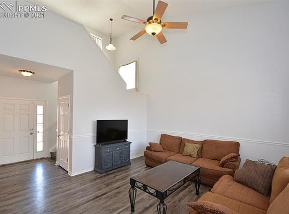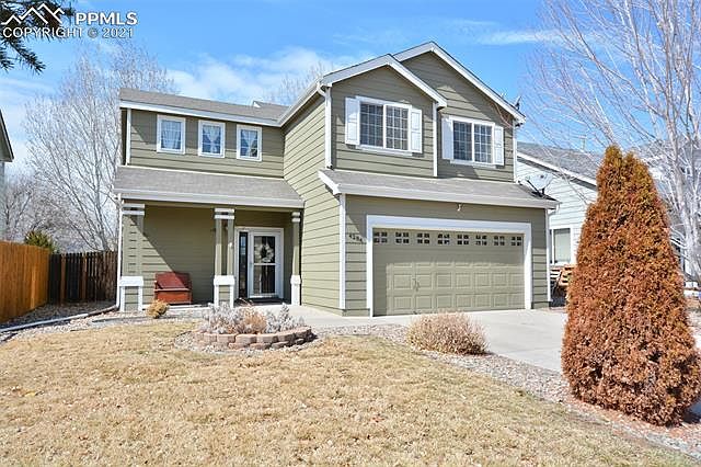 This lovely 2 story home is move-in ready with 3 bedrooms, 3 bathrooms and a 2 car garage. This home has gorgeous curb appeal with like-new exterior paint, mature trees in the front yard, and faux wood shutters on the windows of the 2nd floor, along with 2 eye-catching columns on the front porch. The main level inside has wood laminate flooring throughout and the soaring ceilings make the open floor plan feel bright and airy, which is ideal for entertaining. The living room welcomes you with a large picture window and vaulted ceilings. The functional kitchen features all stainless-steel appliances including a gas stove, generous counter and cabinet space, a pantry and dining nook with wood laminate flooring. Stunning french doors lead out to the wood deck overlooking the fully fenced and landscaped backyard with spectacular mountain views and mature trees. Upstairs, there is a wonderful master retreat with an attached bathroom. Inside, you'll find a double vanity, spacious standing shower, ceramic tile and walk-in closet. 2 more bedrooms, a full bathroom, a linen closet, and sizable laundry room with built-in cabinets complete the upper level. Situated near the intersection of Marksheffel in the community of Colorado Center, this home has easy access to Fort Carson, Peterson Air Force Base or Schriever Air Force Base, and is just minutes from grocery and dining in the Shops at Mesa Ridge. A quick jaunt up to Powers Blvd reveals more shopping, dining, and exploring to meet your heart's contentment.