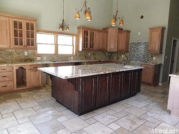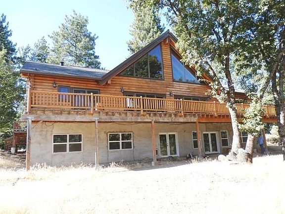 Spacious log home, massive great room with wood floors, vaulted ceiling, fireplace (exterior rock missing), multiple french doors to deck, nice kitchen with granite counters, tile floors, huge island, no appliances etc. Master bedroom & bathroom sinks and other fixtures missing. 2 Additional bedrooms on mail level. Downstairs 1 bedroom plus 2 large rooms and full bath, concrete floors and outside access