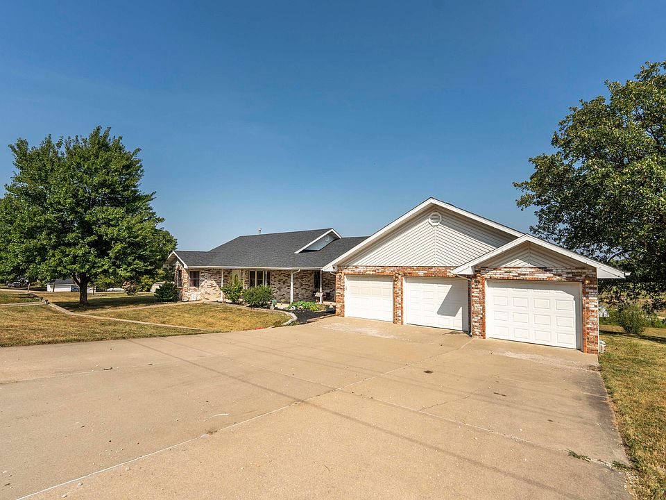 Just north of Bolivar, this beautifully maintained 3 bedroom, 3 bath home sits on 3 acres with no restrictions perfect for families, hobby farming, or anyone craving wide open space with convenience.Built in 1992, the home combines classic charm with thoughtful updates. The low maintenance brick and vinyl exterior is complemented by a welcoming covered front porch and a spacious back deck showcasing breathtaking views. A newer roof (2 years old) adds even more value.Inside, the main level features a bright and open living room with hardwood floors and a vaulted ceiling. The kitchen is well-appointed with abundant cabinetry, granite countertops, stainless steel appliances, and a pantry. Adjacent to the kitchen, the dining area includes a built in china cabinet and windows that flood the space with natural light.The primary suite is generously sized for king furnishings and boasts two walk-in closets, a double-sink vanity, and a walk-in shower. Two additional bedrooms share a full bath, and a versatile extra room makes the perfect office, homework station, or craft nook. The laundry room offers abundant storage and connects directly to the attached three-car garage.The walkout basement provides even more living space with a large family room, full bath, bonus room (ideal as a non-conforming 4th bedroom), storage area, and a two-car garage with shop space. An owned 1,000-gallon propane tank conveys with the property.The location offers the best of both worlds, quiet country living with quick access to Highway 13 for easy trips into Bolivar or Springfield. With 3 acres to roam, you'll have room for kids, pets, a garden, or even a few animals.This property delivers comfort, space, and freedom all in the soughtafter Bolivar School District. Don't miss your chance to make it yours!