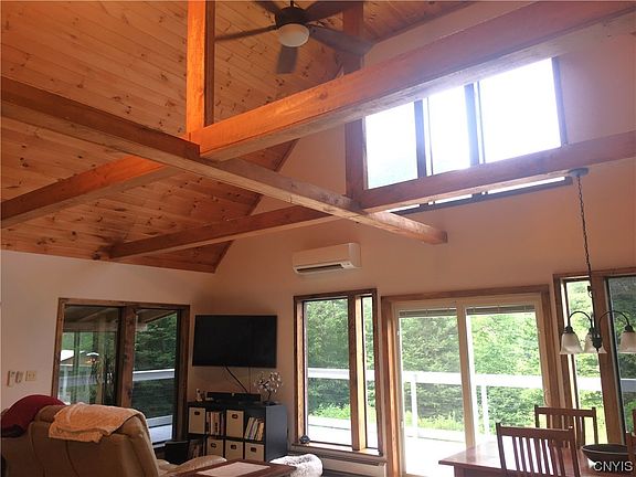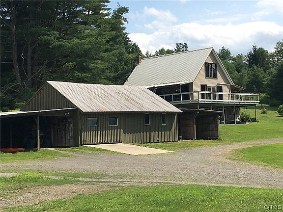 Let me invite you to this one of a kind hidden treasure! Beautiful ten acre property that offers unmatched seclusion and tranquility. Inside this gorgeous custom built home you will fall in love with tongue and groove pine boards on vaulted ceilings, complementing the front wall of windows and sliding glass door. Step onto the huge wrap around deck and enjoy the views as well as the peace and quiet of the country. An open concept kitchen and dining area, complete with a bedroom and a full bath provides a feeling of endless space on the main floor. From there head up the staircase to a large bedroom that features built in storage spaces as well as a sliding glass door that leads to a private balcony. Down the stairs leads to a fully finished basement that could be converted into additional bedrooms. This property features two small ponds, a creek, a fenced in garden area, and multiple outbuildings that are perfect for storing everything you have. One of which is large enough for storing campers and boats. Located only minutes from Maple Hill Golf Course and Marathon, with easy on and off access to Interstate 81. It is located within 45 minutes to Ithaca, Syracuse, and Binghamton.