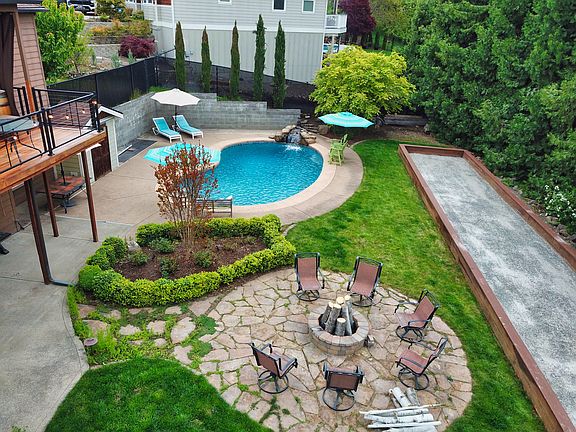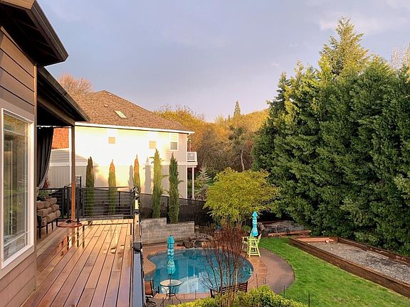 PRIVATE CREEK SIDE BEAUTY WITH VALLEY VIEW. You'll love the ease of living in this light filled two-story located on a cul-de-sac in East Medford's desirable Innsbruck neighborhood.4 bedrms, 3 1/2 baths on .36 acres offers 10 ft ceilings, main floor primary with en suite including large soaker tub, walk-in closet and french doors to an expansive, modern deck. The split floor plan features a Kitchen, dining area, laundry, office and living room and two secondary bedrooms connected by a Jack and Jill bathroom. The lower level invites you to the ''party''! Choose the 4th bedroom with full bath area or head to the large family room with wet bar and a 78'' QLED flatscreen included. From there, flow out to the large creek-side yard where you'll find a custom gunite pool with water feature, regulation size bocce court, fire pit, covered barbecuing area (bbq incl), and raised beds. Professionally landscaped, irrigated and lit. True indoor/ outdoor living make this home a ''destination!''