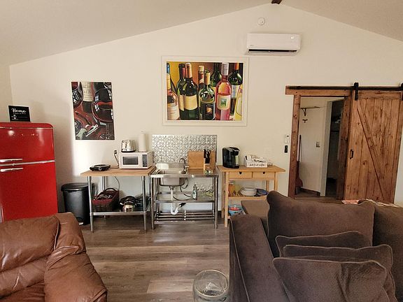 Newly upgraded furnished second floor studio with private balcony and deluxe bath with walk in shower and closet. Sits on 17 acres with walking path that follows the perimeter of the property. Surrounded by forests and meadows. New king mattress (nectar) Kitchenette with hot plate, microwave and air fryer. Air conditioner. 86" screen tv. Pets welcome other than bully breeds due to insurance/liability. Strictly non-smoking. Barn on premises where you can raise chickens. Unit will have a separate meter soon. Until then, electricity paid. Water no charge. Tenant to pay for own internet. Small pets welcome. Refundable deposit of $500 per pet.