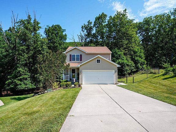 Handsome two story on quiet cul-de-sac. Ground floor offers entry foyer which leads to spacious living room/dining room combo. Dining area walks into well equipped kitchen featuring updated stainless appliances, modern pattern counter tops an abundance of cabinet space. Two car attached garage opens off kitchen. Sliding glass doors off dining area lead to elevated back deck. Half bath off hall on ground floor. Second floor offers three sleeping quarters including spacious master with attached full bath with oversized vanity and walk-in closet. Secondary bedrooms are both quite accommodating as well and offer full size closets. Laundry closet and second full bathroom off hallway. Basement is partially finished offering large den and third full bathroom. Back patio off basement. Fenced in back yard. Gas (propane) log fireplace. New HVAC 9/2022. New stove, fridge and dishwasher 8/2022.