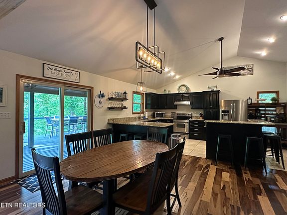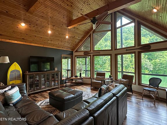 Lakefront with year-round water! Just minutes off of I-75, high-speed internet, huge detached garage with efficiency apartment. This beautiful basement rancher home offers all the amenities you've been waiting for. From the time you step onto the covered front porch with all new composite decking and railing you will appreciate the low maintenance of the home. The foyer is very inviting and looks straight out the rear windows. With all the windows you have views from almost every room. The main level boasts a huge great room, a kitchen with a ton of cabinets and granite countertops, beverage fridge, open shelving, and a ton of seating for all your guests. Just off the dining area is a large covered back deck overlooking beautiful Norris Lake. The entire back deck has been redone with composite decking and stainless steel cable railings to not obstruct your view. Off the great room is the smaller bedroom that could also make a great office. Just down the hall there is a half bath and then the master bedroom with a full en suite bath with soaking tub and a separate tiled walk-in shower. Off the master bedroom, there is a sliding door that leads to the back covered back porch and then onto the sundeck that connects the enclosed hot tub to the main level of the home. The hot tub room has collapsible glass doors if you want to open them and enjoy the fresh air. On the lower level there are two additional bedrooms and another full bath as well as a den that doubles as a game room. There is also a huge crawlspace storage area that is accessible from the lower level. Stroll down to the concrete covered (self adjusting) floating dock down the short concrete path or take the small set of steps, whichever you prefer. This is 2 lots being sold together all for one price. Home comes turnkey and ready for you to enjoy this summer. See the list of items that do not convey with your agent. Don't delay and miss this opportunity. Buyer to verify all information.