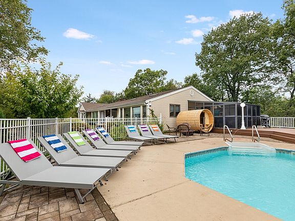 Feel at home in this serene single-family escape nestled in the scenic hills of Monroe, NY. This retreat features 5 bedrooms and 2.5 bathrooms. This bright and beautifully designed home offers sleek hardwood floors, large windows, and stylish decor. The chef's kitchen is fully stocked with premium appliances and cookware, and includes dining space for large groups. Enjoy the seasonal heated pool, cedar sauna, BBQ grill, and deck with outdoor seating and lounge areas. A full laundry with a washer, dryer, and iron is provided. Pool heating is available for $75 per day; please provide at least one day's notice prior to arrival to ensure the pool is heated. The home is conveniently located near ski slopes, hiking trails, wineries, and other local attractions. The pool is open seasonally from March 15 to September 15. The hot tub and sauna are available year-round. Firewood and propane are not provided; please bring your own if you plan to use the fire pit or grill. The pool is professionally maintained every Wednesday and Sunday. Includes a dedicated workspace with fast Wi-Fi. This family-friendly home includes a high chair, kids' play area, and bunk beds. Extra pillows, blankets, and room-darkening shades are provided for restful nights. The 2.5 bathrooms include a luxurious soaking tub and walk-in shower. Toiletries, towels, and cleaning products are included. This is a pet-friendly home.