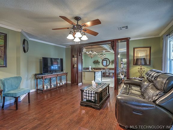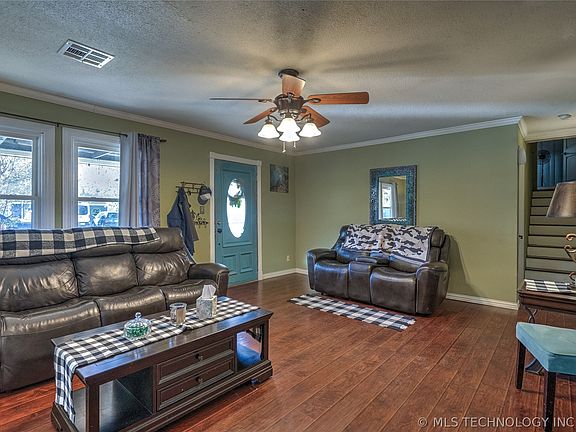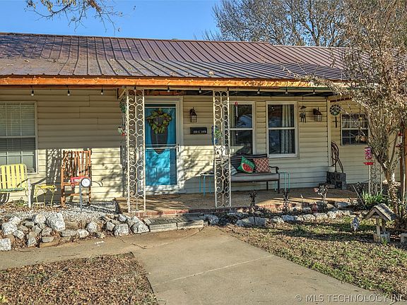 This 3 bedroom home with 3 full baths sits in the heart of Okmulgee. Custom oversized kitchen features a huge island with storage and butcher block counters, space for a full sized dining table and walk in pantry. Formal living along with a den that could be a home office or formal dining. Ground floor bedroom has adjacent hall bath. Home has two master suites; lower level has spacious bedroom with adjoining bath and walk-in closet. Upstairs has updated master with private bathroom. Laundry room has built-in storage and exterior door to the patio. Sitting on a fenced lot that is 1 acre (m/l), you get the best of city living with a private feel. Home has 26 gauge metal roof and updated 5 ton HVAC. Must see to appreciate all of the custom detail throughout.