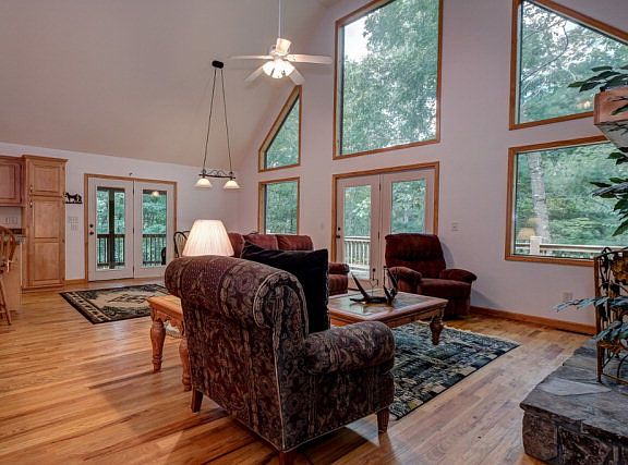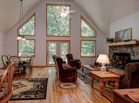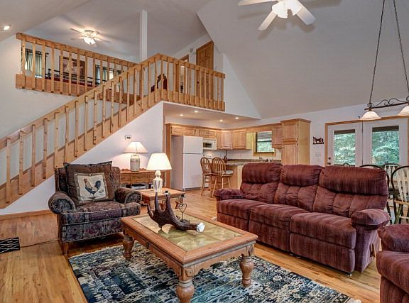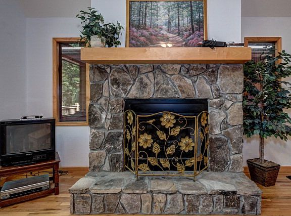Lovely chalet home on level knoll w/ ample parking including your RV. Home is very clean & well maintained . Features 2 bedrooms and 2 baths. A spacious loft bedroom w/ great view, lots of light from the huge chalet windows. An open concept floor plan makes entertaining guests & family fun. Enjoy the warmth and lure of the stone fireplace or relax in the private 400 +/- sq. ft oversized bonus room. This bonus Room has multiple uses. It would make a great mancave, hobby center, craft room or office. Home has a full length covered deck or enjoy the outside on the private back deck.A unique home and must see. Paved road all the way to the home. Easy yearend access. Underground utilities.