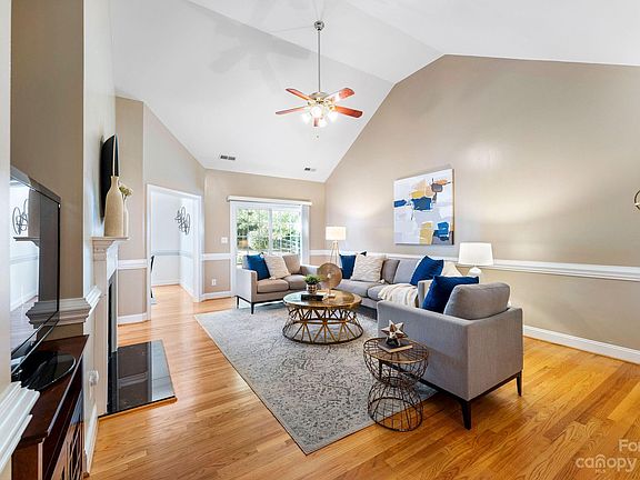 Wonderful 4 bedroom, 3.5 bathroom home on a large 0.65 acre lot. Situated in the private Hunters Pointe community, and zoned for Weddington Schools! Home features real hardwood floors + a thoughtful open concept. Vaulted ceilings in living room and primary suite! Bright oversized kitchen features stainless steel appliances, timeless oak cabinetry, a new range and new dishwasher.