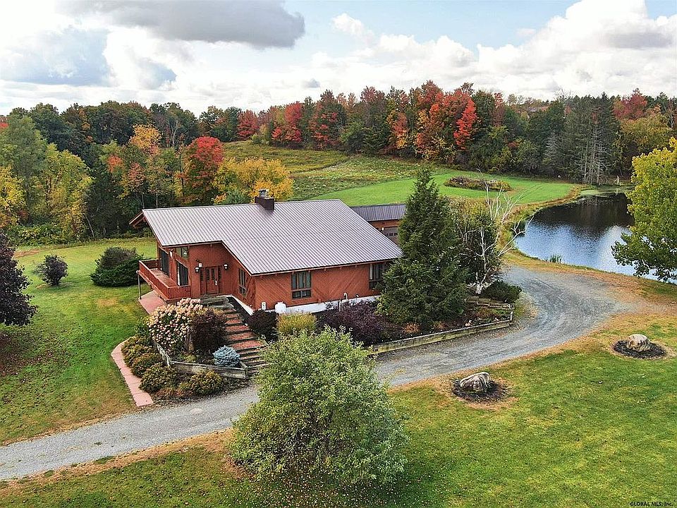Magnificent contemporary situated on 3 landscaped acres w/bridge access to private stocked pond. Also borders 3 acre pond. Main level consists of over 3000 sqft. Floor to ceiling glass, vaulted ceilings and sunrises in the front and sunsets in the rear everyday. Additional lower level boasts 2800 sqft of living space ideal for inlaw set up or professional at home practice. Vermont mountain views always visible