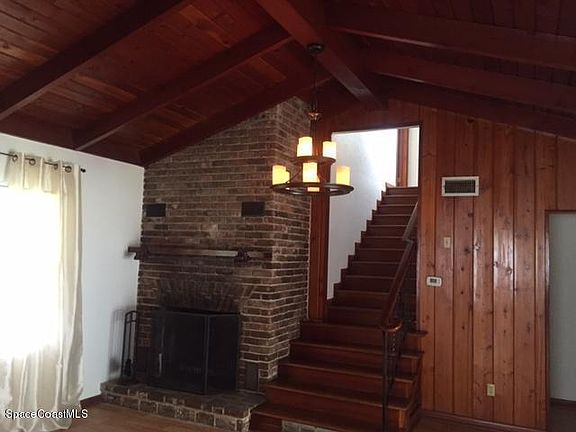 Welcome to your charming country home in the center of Melbourne! Quiet dead end street, mature tropical landscaping, very large back yard with plenty of room to entertain and put a pool! This two story home has one bedroom downstairs and a full bath, the other two bedrooms are upstairs and share the other full bath. All 3 good size and very bright! Large open Living/Dining with original wood beam vaulted ceilings and brick fireplace. Kitchen has new granite countertop with mix of black/stainless appliances, and the vaulted ceiling carries throughout. Very large family across back of home. Come check out this centrally located, quiet, close to everything,full of potential opportunity!