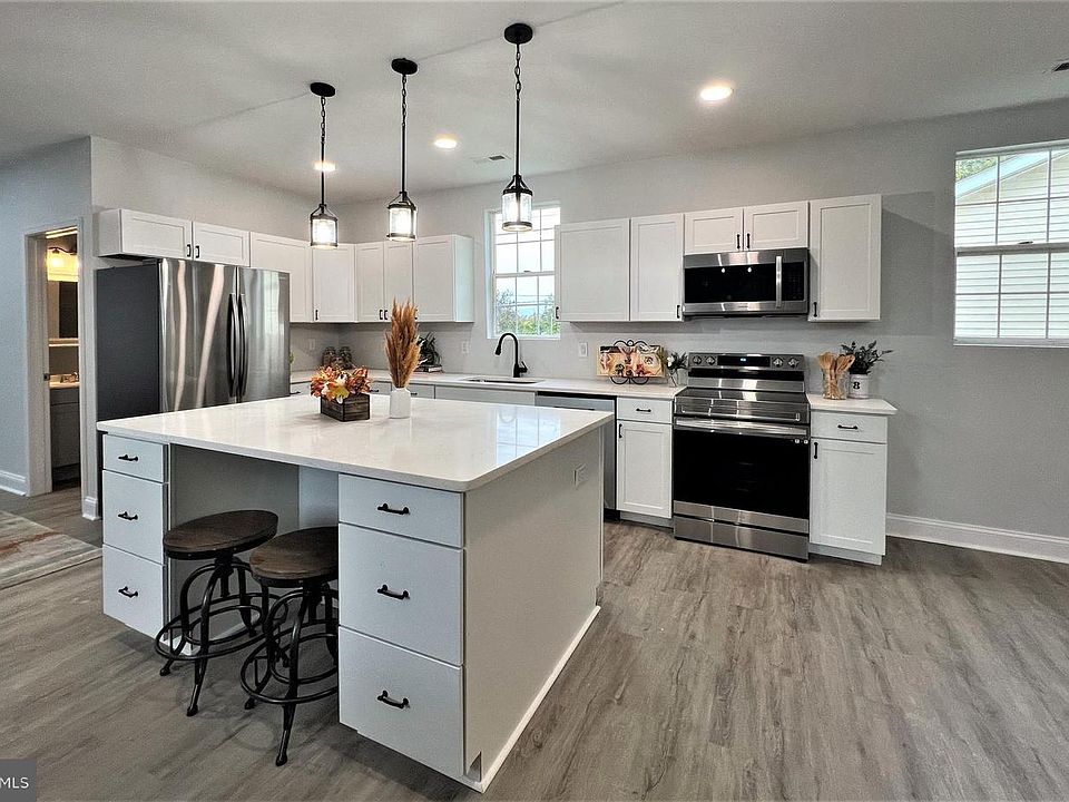 Welcome in the New Year in a New home! This beautiful four bedroom 2 1/2 bath fully renovated home with open concept and was originally a church. It has been meticulously remastered to allow for a grand open concept connecting the entire living space all in one. Once you enter this home you will surely be blown away. Drop your bags in the foyer and indulge in the beautiful kitchen design equipped with quartz counter tops. Details in the kitchen include oil rubbed bronze handles and faucet, white cabinets, stainless steel appliances and a grand center island with seating. The home has been staged for photos but this home truly offers a blank canvas that you could design a thousand times over. The entire home has all new luxury vinyl plank flooring, electrical, framing, drywall, plumbing supplies and drains as well as designed HVAC system. The first floor includes a half bathroom and laundry room in the front of the home. In the back of the house there is a utility closet that also offers ample storage. Take the stairs up to the primary bedroom on the second floor. The primary bedroom has its own full bathroom with tiled floor and shower. Each bedroom on the second floor was designed to give the maximum amount of space per bedroom along with vaulted ceilings and a ceiling fan in each room. In the center of the hallway is a large bathroom that has a separate vanity outside of the main bathroom to allow for privacy and functionality. Designed for its next chapter with over 2100 Sqft of space, there's truly nothing like it on the market. Schedule your tour today for 429 N. Church Street or attend the open house.