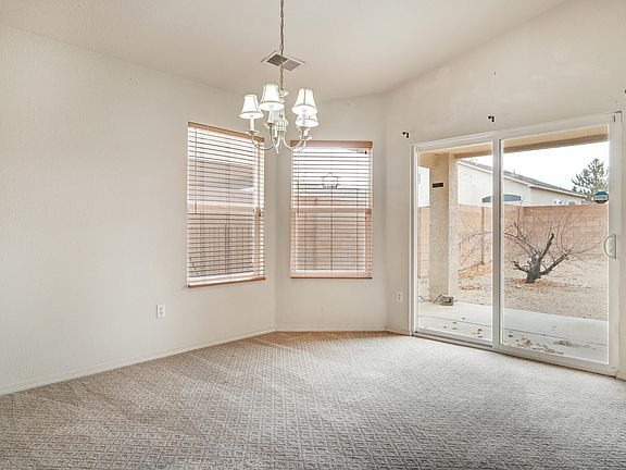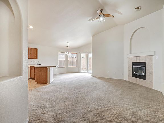 Fantastic location & fabulous amenities on this Northern Meadows, DR Horton home. Crisp, neutral palette from the walls to the flooring & fixtures--perfect to bring your interior style to life. High ceilings & many windows fill space w/natural light. Generous rooms w/lovely architectural features including bay window & radius corners. Ceiling fans & refrigerated air. Living room features open concept & low maintenance gas log fireplace. Owner's suite w/custom walk-in closet, en suite bath w/dual sink vanity, soaking tub & walk-in shower. Ample space in the backyard for entertaining, gardening, & fur family to safely play. Xeriscaped yard adds to the curb appeal. Close to parks, open space, and Rio Rancho Event Center. Don't miss this home that's priced to sell!