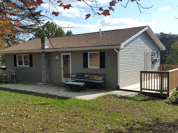 Beautiful country setting. Lots of outdoor living space created to enjoy mother nature. It has a large master bedroom with a decorative ceiling. The living and kitchen is an open floor plan. The living room has a vaulted ceiling. The house has one bathroom and a small 2nd bedroom. The 2nd floor is 960 sq ft and the 1st floor is 960 sq ft. The outside is finished. New roof, new deck, new siding, front and back patios. The heating system is 1 year old, forced hot air. All the duct work is set up for central air. Footers were put in the patio if you want a hot tub. Reinforcements put in front porch roof for a swing. The house has been a work in progress. It needs someone to love it and update the flooring and paint. Just small cosmetic work left to do in the upstairs interior. Comes with stove, fridge, microwave, and dishwasher. Downstairs is unfinished but could make a nice rec room, spare room and 2nd bath. Lots of possibilities. There is a large shed that has a loft for additional storage. The yard is large, 2+ acres, and includes a tractor with 150hrs. It was designed to look like a park or golf course. It has a well and septic. The water is very good. There is a spring down the hill from the house.