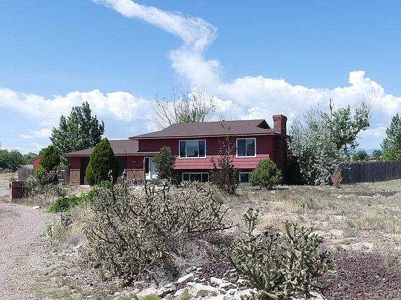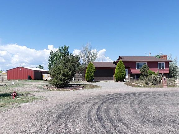 Two acres!!! Two 30 x 40 metal outbuildings!!! Two level home with 4 bedrooms and 2 baths! Two car attached garage is huge and has a tall door. Wonderful location on a paved road at the end of the cul-de-sac, and there is open space on three sides of this lot. Nice views of Pikes Peak from the multi-level back deck. Privacy fenced yard in back on just a small portion of the property. Entry level has a storm door and separate door directly into the garage. Upper level of home has large living room, dining area next to kitchen with a nice western mountain view out the window over the sink. Plus 2 bedrooms share a full bath. The lower level is all tiled, and has a large family room with a built-in bookcase, and a woodstove. It also has 2 bedrooms, a laundry room with the furnace and water heater, and a 3/4 bath between the bedrooms. Front yard has a rocked circle drive, trees, cacti and rocks. Back yard is accessible from the upper level of the home and has a couple levels for multi seating options, and a concrete pad at the bottom with electricity if you should wish to reinstall a hot tub later. There is also rock, various sitting areas, a firepit, drive-in gate to the back yard and access to the older of the outbuildings through this yard. It also has a garage door which opens outside of the fence. Around the side of the house, you can drive to both outbuildings. The newer one has 3 garage doors!!! The home needs your personal touches and updating.