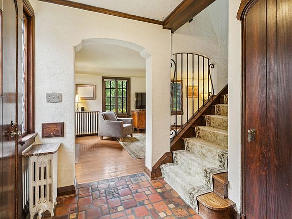 entry note the unique tile flooring crafted by tile makers at the Moravian Pottery which originally opened in 1912. Coved ceilings, custom ironwork, relief plaster moldings, corner built-ins are just a few of the items that set this home apart from the rest. The main level features a kitchen and great room addition, keeping with the original style of the home. The gourmet kitchen features Miele appliances, quartz counters and custom cabinetry. There is also a small library just adjacent to